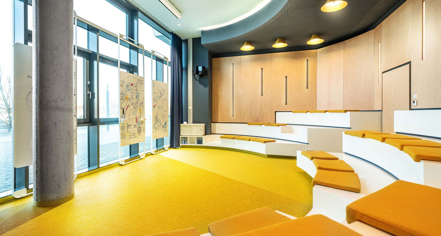 Auf einer Grundfläche von nur 50 Quadratmetern haben wie es geschafft durch die optimale Einzirklung einer Sitzstufenlandschaft Platz für 28 Teilnehmer zu erschaffen. Durch Aufnahme und Wiederholung der Grundstruktur der Sitzlandschaft im Bereich der Decke, wurde der Raum so zusätzlich aufgewertet.